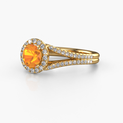This 14 Carat gold ring is called Verla rnd 2 and is set with 6.5 mm citrin. This exclusive gold halo engagement ring is a true work of art! The ornaments are crafted with a lot of patience and great passion. In order to create this ring with great precision, this craft requires a keen eye and skilful hand. A challenge which ignites a fire in our expert goldsmith. The exquisite citrin are set in a special way so they stand out even more. This gives the ring an even more glamorous appearance. The split band engagement ring is actually unique on its own because of the gemstones which we carefully select especially for this ring. On top of that you select the precious metals which will be used to create a unique ring for the most extraordinary woman in your life! This jewel is made just for you, with attention to detail and design.Because we design and deliver our own rings, we can offer you a engagement ring at a price you won't find anywhere else. A ring is made to order, which helps prevent excess supplies, so we can make you a great price offer. We understand it feels risky, buying your engagement ring online, but we will gladly assist in the designing process, taking your budget into consideration.Our team adds new designs to our online collection daily. Our designers and goldsmiths work together in creating the best design. We strive to offer a diverse collection of jewels. Perhaps you have a specific jewel design in mind. One you came across somewhere. Please contact us for a free consultation. We will make you an offer, based on a fair price/ quality ratio, that will baffle you.To make it easier for you, we offer a 30 day return policy. Check our terms and conditions.
