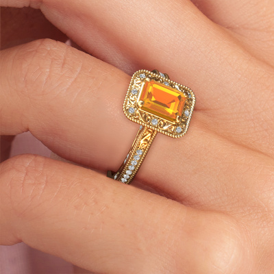 This 14 Carat gold ring is called Alice EME and is set with 7x5 mm citrin. An extraordinary gold vintage ring. One that will surely make the love of your life shine like a diamond! That is what we hope to achieve. This vintage Engagement ring is set with exquisite citrin. Whichever gemstone you choose from our selection, is up to you. The gemstone is selected with great care because we believe your pearl edges Engagement ring must be adorned with nothing but the most beautiful gemstone. Wouldn't you agree? Our expert goldsmith will design your ring in our own crafting studio, where the citrin will be set with great precision. The ring will then be polished till it shines perfectly. Nothing but the best for the love of your life! This jewel is made just for you by our master goldsmiths in our own studio.By using a combination of the latest modern techniques, combined with ancient crafting, we can make all our Engagement rings in our own studio. Each jewel is made to order. This is advantageous because we can offer you a price you won't find anywhere else.Do you have a specific ring in mind? One you came across somewhere. Please feel free to tell us your wishes and we will turn your design into a unique Engagement ring. You can follow the development of your ring design because we use 3D drawings. This gives you a realistic preview of your design. We will gladly send you a non-binding offer, based on a fair price/ quality ratio. It will amaze you.To make it easier for you, we offer a 30 day return policy. Check our terms and conditions.
