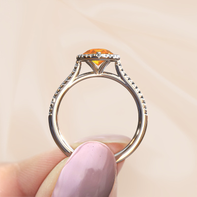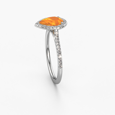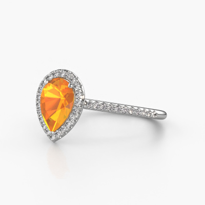 The ring shown above is called the Seline per 2. We call this type of ring a halo ring because it has one centre gemstone and a band that is also pave set with gemstones. The platinum engagement ring is set with a pear 8x6 mm citrin centre stone and the band is pave set with diamonds. What makes this classic platinum halo ring special are the smaller sized stones embracing the centre stone. This gorgeous engagement ring is called a halo ring because the smaller gemstones give the centre stone a halo of surrounding light. In order for the smaller stones to enhance the centre stone, they have to be placed so there is no interference of light. And that's when our expert goldsmiths come in. Each individual stone is carefully set in the ring by hand. During manufacturing, light fall is constantly monitored to make sure the special halo is still visible. In the end you get a unique engagement ring, with a citrin of your choosing at its centre. You can imagine the effect of a ring of such significance when you give it to her on her special day to shine. Because we design and deliver our own rings, we can offer you a engagement ring at a price you won't find anywhere else. A ring is made to order, which helps prevent excess supplies, so we can make you a great price offer. We understand it feels risky, buying your engagement ring online, but we will gladly assist in the designing process, taking your budget into consideration.Our designers and goldsmiths work together each day, creating new jewels. Perhaps you have found a nice classic engagement ring somewhere, which can be used to customize your unique ring. Please feel free to contact us. We will make you an offer, based on a fair price/ quality ratio, which will amaze you.To make it easier for you, we offer a 30 day return policy. Check our terms and conditions.