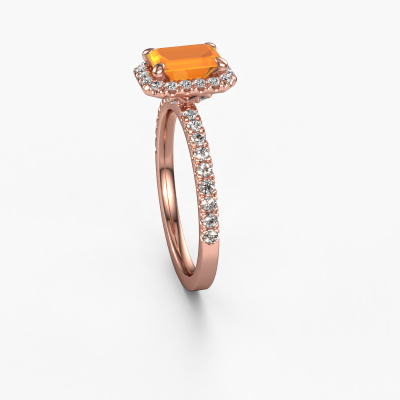The ring shown above is called the Miranda eme. We call this type of ring a halo ring because it has one centre gemstone and a band that is also pave set with gemstones. The 14 Carat rose gold engagement ring is set with a emerald cut 7x5 mm citrin centre stone and the band is pave set with diamonds. What makes this classic rose gold halo ring special are the smaller sized stones embracing the centre stone. This gorgeous engagement ring is called a halo ring because the smaller gemstones give the centre stone a halo of surrounding light. In order for the smaller stones to enhance the centre stone, they have to be placed so there is no interference of light. And that's when our expert goldsmiths come in. Each individual stone is carefully set in the ring by hand. During manufacturing, light fall is constantly monitored to make sure the special halo is still visible. In the end you get a unique engagement ring, with a citrin of your choosing at its centre. You can imagine the effect of a ring of such significance when you give it to her on her special day to shine. By using a combination of the latest modern techniques, combined with ancient crafting, we can make all our engagement rings in our own studio. Each jewel is made to order. This is advantageous because we can offer you a price you won't find anywhere else.Our designers and goldsmiths work together each day, creating new jewels. Perhaps you have found a nice classic engagement ring somewhere, which can be used to customize your unique ring. Please feel free to contact us. We will make you an offer, based on a fair price/ quality ratio, which will amaze you.To make it easier for you, we offer a 30 day return policy. Check our terms and conditions.