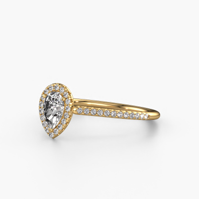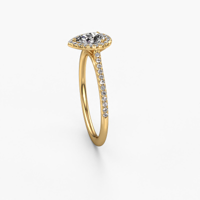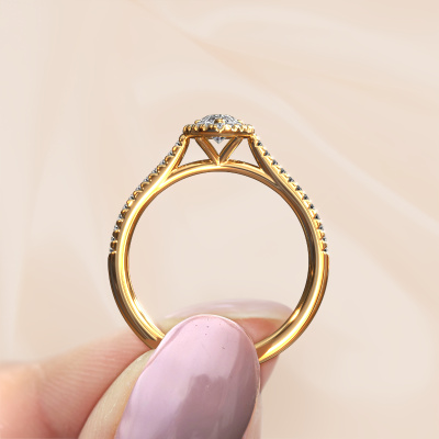 The ring shown above is called the Seline per 2. We call this type of ring a halo ring because it has one centre gemstone and a band that is also pave set with gemstones. The 14 Carat gold engagement ring is set with a pear 0.45 crt diamond centre stone and the band is pave set with diamonds. What makes this classic gold halo ring special are the smaller sized stones embracing the centre stone. This gorgeous engagement ring is called a halo ring because the smaller gemstones give the centre stone a halo of surrounding light. In order for the smaller stones to enhance the centre stone, they have to be placed so there is no interference of light. And that's when our expert goldsmiths come in. Each individual stone is carefully set in the ring by hand. During manufacturing, light fall is constantly monitored to make sure the special halo is still visible. In the end you get a unique engagement ring, with a diamond of your choosing at its centre. You can imagine the effect of a ring of such significance when you give it to her on her special day to shine. Because we design and deliver our own rings, we can offer you a engagement ring at a price you won't find anywhere else. A ring is made to order, which helps prevent excess supplies, so we can make you a great price offer. We understand it feels risky, buying your engagement ring online, but we will gladly assist in the designing process, taking your budget into consideration.Our designers and goldsmiths work together each day, creating new jewels. Perhaps you have found a nice classic engagement ring somewhere, which can be used to customize your unique ring. Please feel free to contact us. We will make you an offer, based on a fair price/ quality ratio, which will amaze you.To make it easier for you, we offer a 30 day return policy. Check our terms and conditions.