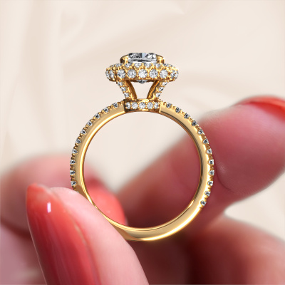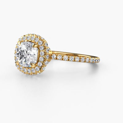 The ring shown above is called the Talitha CUS. We call this type of ring a halo ring because it has one centre gemstone and a band that is also pave set with gemstones. The 14 Carat gold engagement ring is set with a cushion 1.50 crt diamond centre stone and the band is pave set with diamonds. What makes this traditional gold halo ring special are the smaller sized stones embracing the centre stone. This gorgeous engagement ring is called a halo ring because the smaller gemstones give the centre stone a halo of surrounding light. In order for the smaller stones to enhance the centre stone, they have to be placed so there is no interference of light. And that's when our expert goldsmiths come in. Each individual stone is carefully set in the ring by hand. During manufacturing, light fall is constantly monitored to make sure the special halo is still visible. In the end you get a unique engagement ring, with a diamond of your choosing at its centre. You can imagine the effect of a ring of such significance when you give it to her on her special day to shine. Because we design and deliver our own rings, we can offer you a engagement ring at a price you won't find anywhere else. A ring is made to order, which helps prevent excess supplies, so we can make you a great price offer. We understand it feels risky, buying your engagement ring online, but we will gladly assist in the designing process, taking your budget into consideration.Our designers and goldsmiths work together each day, creating new jewels. Perhaps you have found a nice traditional engagement ring somewhere, which can be used to customize your unique ring. Please feel free to contact us. We will make you an offer, based on a fair price/ quality ratio, which will amaze you.To make it easier for you, we offer a 30 day return policy. Check our terms and conditions.