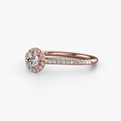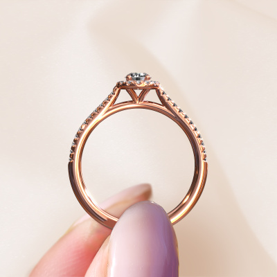 The ring shown above is called the Seline rnd 2. We call this type of ring a halo ring because it has one centre gemstone and a band that is also pave set with gemstones. The 14 Carat rose gold engagement ring is set with a round 0.25 crt diamond centre stone and the band is pave set with lab-grown diamonds. What makes this exclusive rose gold halo ring special are the smaller sized stones embracing the centre stone. This gorgeous engagement ring is called a halo ring because the smaller gemstones give the centre stone a halo of surrounding light. In order for the smaller stones to enhance the centre stone, they have to be placed so there is no interference of light. And that's when our expert goldsmiths come in. Each individual stone is carefully set in the ring by hand. During manufacturing, light fall is constantly monitored to make sure the special halo is still visible. In the end you get a unique engagement ring, with a diamond of your choosing at its centre. You can imagine the effect of a ring of such significance when you give it to her on her special day to shine. After receiving your order, our goldsmiths will start the creative process of making your Seline rnd 2 engagement ring. We don't keep stock. This is advantageous because these costs will not be passed on to you. Therefore, we can offer jewellery at exceptionally low prices.Our team adds new designs to our online collection daily. Our designers and goldsmiths work together in creating the best design. We strive to offer a diverse collection of jewels. Perhaps you have a specific jewel design in mind. One you came across somewhere. Please contact us for a free consultation. We will make you an offer, based on a fair price/ quality ratio, that will baffle you.To make it easier for you, we offer a 30 day return policy. Check our terms and conditions.