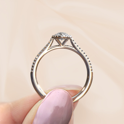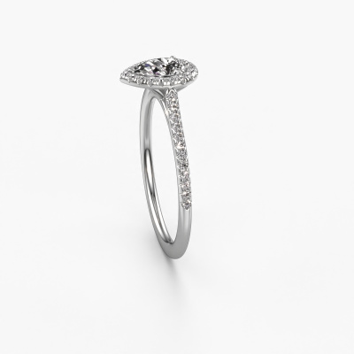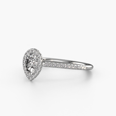 The ring shown above is called the Seline per 2. We call this type of ring a halo ring because it has one centre gemstone and a band that is also pave set with gemstones. The 14 Carat white gold engagement ring is set with a pear 0.45 crt diamond centre stone and the band is pave set with diamonds. What makes this classic white gold halo ring special are the smaller sized stones embracing the centre stone. This gorgeous engagement ring is called a halo ring because the smaller gemstones give the centre stone a halo of surrounding light. In order for the smaller stones to enhance the centre stone, they have to be placed so there is no interference of light. And that's when our expert goldsmiths come in. Each individual stone is carefully set in the ring by hand. During manufacturing, light fall is constantly monitored to make sure the special halo is still visible. In the end you get a unique engagement ring, with a diamond of your choosing at its centre. You can imagine the effect of a ring of such significance when you give it to her on her special day to shine. Because we design and deliver our own rings, we can offer you a engagement ring at a price you won't find anywhere else. A ring is made to order, which helps prevent excess supplies, so we can make you a great price offer. We understand it feels risky, buying your engagement ring online, but we will gladly assist in the designing process, taking your budget into consideration.Our designers and goldsmiths work together each day, creating new jewels. Perhaps you have found a nice classic engagement ring somewhere, which can be used to customize your unique ring. Please feel free to contact us. We will make you an offer, based on a fair price/ quality ratio, which will amaze you.To make it easier for you, we offer a 30 day return policy. Check our terms and conditions.