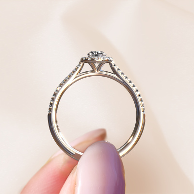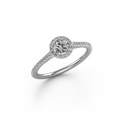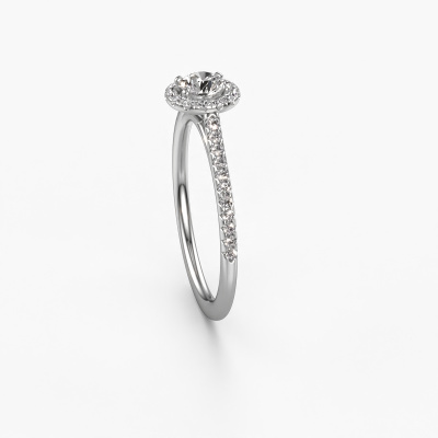 The ring shown above is called the Seline rnd 2. We call this type of ring a halo ring because it has one centre gemstone and a band that is also pave set with gemstones. The 14 Carat white gold engagement ring is set with a round 0.30 crt diamond centre stone and the band is pave set with lab-grown diamonds. What makes this exclusive white gold halo ring special are the smaller sized stones embracing the centre stone. This gorgeous engagement ring is called a halo ring because the smaller gemstones give the centre stone a halo of surrounding light. In order for the smaller stones to enhance the centre stone, they have to be placed so there is no interference of light. And that's when our expert goldsmiths come in. Each individual stone is carefully set in the ring by hand. During manufacturing, light fall is constantly monitored to make sure the special halo is still visible. In the end you get a unique engagement ring, with a diamond of your choosing at its centre. You can imagine the effect of a ring of such significance when you give it to her on her special day to shine. After receiving your order, our goldsmiths will start the creative process of making your Seline rnd 2 engagement ring. We don't keep stock. This is advantageous because these costs will not be passed on to you. Therefore, we can offer jewellery at exceptionally low prices.Our team adds new designs to our online collection daily. Our designers and goldsmiths work together in creating the best design. We strive to offer a diverse collection of jewels. Perhaps you have a specific jewel design in mind. One you came across somewhere. Please contact us for a free consultation. We will make you an offer, based on a fair price/ quality ratio, that will baffle you.To make it easier for you, we offer a 30 day return policy. Check our terms and conditions.