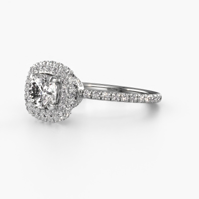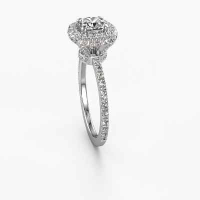 The ring shown above is called the Talitha CUS. We call this type of ring a halo ring because it has one centre gemstone and a band that is also pave set with gemstones. The 14 Carat white gold engagement ring is set with a cushion 1.00 crt diamond centre stone and the band is pave set with diamonds. What makes this traditional white gold halo ring special are the smaller sized stones embracing the centre stone. This gorgeous engagement ring is called a halo ring because the smaller gemstones give the centre stone a halo of surrounding light. In order for the smaller stones to enhance the centre stone, they have to be placed so there is no interference of light. And that's when our expert goldsmiths come in. Each individual stone is carefully set in the ring by hand. During manufacturing, light fall is constantly monitored to make sure the special halo is still visible. In the end you get a unique engagement ring, with a diamond of your choosing at its centre. You can imagine the effect of a ring of such significance when you give it to her on her special day to shine. Because we design and deliver our own rings, we can offer you a engagement ring at a price you won't find anywhere else. A ring is made to order, which helps prevent excess supplies, so we can make you a great price offer. We understand it feels risky, buying your engagement ring online, but we will gladly assist in the designing process, taking your budget into consideration.Our designers and goldsmiths work together each day, creating new jewels. Perhaps you have found a nice traditional engagement ring somewhere, which can be used to customize your unique ring. Please feel free to contact us. We will make you an offer, based on a fair price/ quality ratio, which will amaze you.To make it easier for you, we offer a 30 day return policy. Check our terms and conditions.