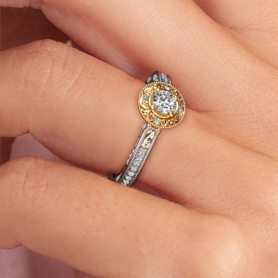 This 14 Carat white gold ring is called Alice RND and is set with 0.43 crt diamond. An extraordinary white gold vintage ring. One that will surely make the love of your life shine like a diamond! That is what we hope to achieve. This vintage Engagement ring is set with exquisite diamond. Whichever gemstone you choose from our selection, is up to you. The gemstone is selected with great care because we believe your pearl edges Engagement ring must be adorned with nothing but the most beautiful gemstone. Wouldn't you agree? Our expert goldsmith will design your ring in our own crafting studio, where the diamond will be set with great precision. The ring will then be polished till it shines perfectly. Nothing but the best for the love of your life! This jewel is made to shine bright around your finger. Each jewel is hand made with love by our goldsmiths.Are you on a budget? Please feel free to contact us, so we can go discuss your options. We offer our Engagement rings at guaranteed best price, because we make them to order. You won't find such a price anywhere else!Our team adds new designs to our online collection daily. Our designers and goldsmiths work together in creating the best design. We strive to offer a diverse collection of jewels. Perhaps you have a specific jewel design in mind. One you came across somewhere. Please contact us for a free consultation. We will make you an offer, based on a fair price/ quality ratio, that will baffle you.To make it easier for you, we offer a 30 day return policy. Check our terms and conditions.