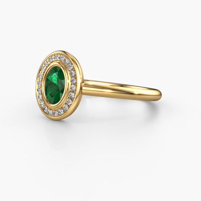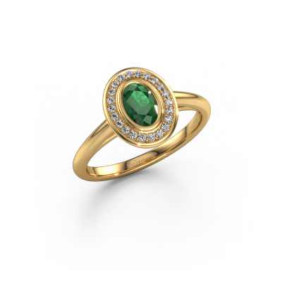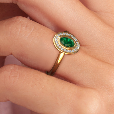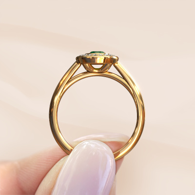 The ring shown above is called the Noud 1 OVL. We call this type of ring a halo ring because it has one centre gemstone and a band that is also pave set with gemstones. The 14 Carat gold engagement ring is set with a oval 6x4 mm emerald centre stone and the band is pave set with lab-grown diamonds. What makes this classic gold halo ring special are the smaller sized stones embracing the centre stone. This gorgeous engagement ring is called a halo ring because the smaller gemstones give the centre stone a halo of surrounding light. In order for the smaller stones to enhance the centre stone, they have to be placed so there is no interference of light. And that's when our expert goldsmiths come in. Each individual stone is carefully set in the ring by hand. During manufacturing, light fall is constantly monitored to make sure the special halo is still visible. In the end you get a unique engagement ring, with a emerald of your choosing at its centre. You can imagine the effect of a ring of such significance when you give it to her on her special day to shine. By using a combination of the latest modern techniques, combined with ancient crafting, we can make all our engagement rings in our own studio. Each jewel is made to order. This is advantageous because we can offer you a price you won't find anywhere else.Our team adds new designs to our online collection daily. Our designers and goldsmiths work together in creating the best design. We strive to offer a diverse collection of jewels. Perhaps you have a specific jewel design in mind. One you came across somewhere. Please contact us for a free consultation. We will make you an offer, based on a fair price/ quality ratio, that will baffle you.To make it easier for you, we offer a 30 day return policy. Check our terms and conditions.