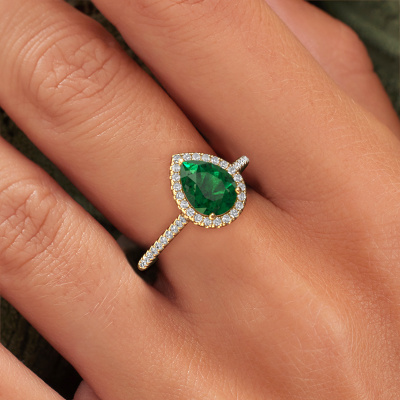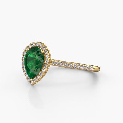 The ring shown above is called the Seline per 2. We call this type of ring a halo ring because it has one centre gemstone and a band that is also pave set with gemstones. The 14 Carat gold engagement ring is set with a pear 8x6 mm emerald centre stone and the band is pave set with diamonds. What makes this classic gold halo ring special are the smaller sized stones embracing the centre stone. This gorgeous engagement ring is called a halo ring because the smaller gemstones give the centre stone a halo of surrounding light. In order for the smaller stones to enhance the centre stone, they have to be placed so there is no interference of light. And that's when our expert goldsmiths come in. Each individual stone is carefully set in the ring by hand. During manufacturing, light fall is constantly monitored to make sure the special halo is still visible. In the end you get a unique engagement ring, with a emerald of your choosing at its centre. You can imagine the effect of a ring of such significance when you give it to her on her special day to shine. Because we design and deliver our own rings, we can offer you a engagement ring at a price you won't find anywhere else. A ring is made to order, which helps prevent excess supplies, so we can make you a great price offer. We understand it feels risky, buying your engagement ring online, but we will gladly assist in the designing process, taking your budget into consideration.Our designers and goldsmiths work together each day, creating new jewels. Perhaps you have found a nice classic engagement ring somewhere, which can be used to customize your unique ring. Please feel free to contact us. We will make you an offer, based on a fair price/ quality ratio, which will amaze you.To make it easier for you, we offer a 30 day return policy. Check our terms and conditions.