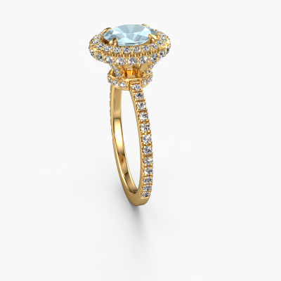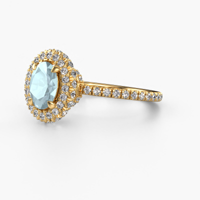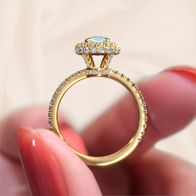 The ring shown above is called the Talitha OVL. We call this type of ring a halo ring because it has one centre gemstone and a band that is also pave set with gemstones. The 14 Carat gold engagement ring is set with a oval 7x5 mm aquamarine centre stone and the band is pave set with lab-grown diamonds. What makes this classic gold halo ring special are the smaller sized stones embracing the centre stone. This gorgeous engagement ring is called a halo ring because the smaller gemstones give the centre stone a halo of surrounding light. In order for the smaller stones to enhance the centre stone, they have to be placed so there is no interference of light. And that's when our expert goldsmiths come in. Each individual stone is carefully set in the ring by hand. During manufacturing, light fall is constantly monitored to make sure the special halo is still visible. In the end you get a unique engagement ring, with a aquamarine of your choosing at its centre. You can imagine the effect of a ring of such significance when you give it to her on her special day to shine. By using a combination of the latest modern techniques, combined with ancient crafting, we can make all our engagement rings in our own studio. Each jewel is made to order. This is advantageous because we can offer you a price you won't find anywhere else.Our designers and goldsmiths work together each day, creating new jewels. Perhaps you have found a nice classic engagement ring somewhere, which can be used to customize your unique ring. Please feel free to contact us. We will make you an offer, based on a fair price/ quality ratio, which will amaze you.To make it easier for you, we offer a 30 day return policy. Check our terms and conditions.
