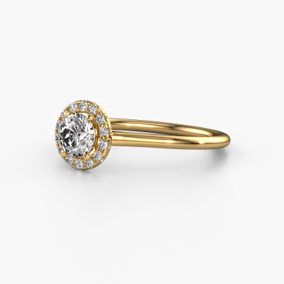 The ring shown above is called the Seline rnd 1. We call this type of ring a halo ring because it has one centre gemstone and a band that is also pave set with gemstones. The 14 Carat gold engagement ring is set with a round 0.50 crt diamond centre stone and the band is pave set with diamonds. What makes this classic gold halo ring special are the smaller sized stones embracing the centre stone. This gorgeous engagement ring is called a halo ring because the smaller gemstones give the centre stone a halo of surrounding light. In order for the smaller stones to enhance the centre stone, they have to be placed so there is no interference of light. And that's when our expert goldsmiths come in. Each individual stone is carefully set in the ring by hand. During manufacturing, light fall is constantly monitored to make sure the special halo is still visible. In the end you get a unique engagement ring, with a diamond of your choosing at its centre. You can imagine the effect of a ring of such significance when you give it to her on her special day to shine. By using our modern techniques, we can design and customize the finest quality jewels with the utmost care for you. Our engagement rings are always priced 30 percent lower than other jewellers. We make engagement rings to order so we don't have to maintain a large stock. If you have a certain budget, we are more than happy to advice you accordingly.Different styles of new rings are made daily by our team. Perhaps you have found a halo engagement ring somewhere. One you would like to give to your loved one. Please feel free to share your thoughts and design with our jewel designers. We would love to turn your design into a classic engagement ring. You can follow the development of your ring design because we use very detailed 3D drawings. On top of that, you can order a dummy of the design. A dummy is a plastic ring, which can be shaped according your ring design. You can try it on and check if the engagement ring is up to standard. We will gladly send you a non-binding offer, based on a fair price/ quality ratio. The offer will baffle you, considering the quality of the ring and gemstones.To make it easier for you, we offer a 30 day return policy. Check our terms and conditions.