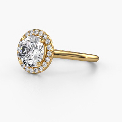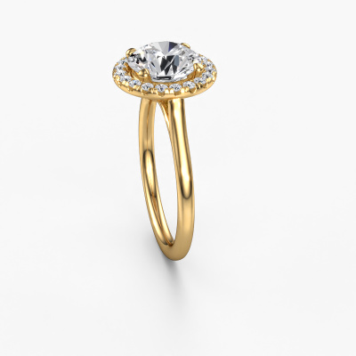 The ring shown above is called the Seline rnd 1. We call this type of ring a halo ring because it has one centre gemstone and a band that is also pave set with gemstones. The 14 Carat gold engagement ring is set with a round 2.00 crt diamond centre stone and the band is pave set with diamonds. What makes this classic gold halo ring special are the smaller sized stones embracing the centre stone. This gorgeous engagement ring is called a halo ring because the smaller gemstones give the centre stone a halo of surrounding light. In order for the smaller stones to enhance the centre stone, they have to be placed so there is no interference of light. And that's when our expert goldsmiths come in. Each individual stone is carefully set in the ring by hand. During manufacturing, light fall is constantly monitored to make sure the special halo is still visible. In the end you get a unique engagement ring, with a diamond of your choosing at its centre. You can imagine the effect of a ring of such significance when you give it to her on her special day to shine. By using our modern techniques, we can design and customize the finest quality jewels with the utmost care for you. Our engagement rings are always priced 30 percent lower than other jewellers. We make engagement rings to order so we don't have to maintain a large stock. If you have a certain budget, we are more than happy to advice you accordingly.Different styles of new rings are made daily by our team. Perhaps you have found a halo engagement ring somewhere. One you would like to give to your loved one. Please feel free to share your thoughts and design with our jewel designers. We would love to turn your design into a classic engagement ring. You can follow the development of your ring design because we use very detailed 3D drawings. On top of that, you can order a dummy of the design. A dummy is a plastic ring, which can be shaped according your ring design. You can try it on and check if the engagement ring is up to standard. We will gladly send you a non-binding offer, based on a fair price/ quality ratio. The offer will baffle you, considering the quality of the ring and gemstones.To make it easier for you, we offer a 30 day return policy. Check our terms and conditions.