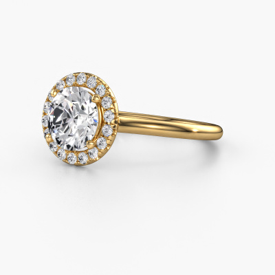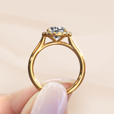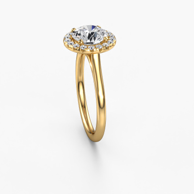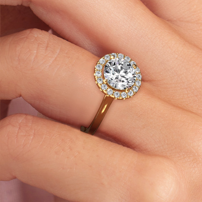 The ring shown above is called the Seline rnd 1. We call this type of ring a halo ring because it has one centre gemstone and a band that is also pave set with gemstones. The 14 Carat gold engagement ring is set with a round 1.50 crt lab grown diamond centre stone and the band is pave set with diamonds. What makes this classic gold halo ring special are the smaller sized stones embracing the centre stone. This gorgeous engagement ring is called a halo ring because the smaller gemstones give the centre stone a halo of surrounding light. In order for the smaller stones to enhance the centre stone, they have to be placed so there is no interference of light. And that's when our expert goldsmiths come in. Each individual stone is carefully set in the ring by hand. During manufacturing, light fall is constantly monitored to make sure the special halo is still visible. In the end you get a unique engagement ring, with a lab grown diamond of your choosing at its centre. You can imagine the effect of a ring of such significance when you give it to her on her special day to shine. By using our modern techniques, we can design and customize the finest quality jewels with the utmost care for you. Our engagement rings are always priced 30 percent lower than other jewellers. We make engagement rings to order so we don't have to maintain a large stock. If you have a certain budget, we are more than happy to advice you accordingly.Different styles of new rings are made daily by our team. Perhaps you have found a halo engagement ring somewhere. One you would like to give to your loved one. Please feel free to share your thoughts and design with our jewel designers. We would love to turn your design into a classic engagement ring. You can follow the development of your ring design because we use very detailed 3D drawings. On top of that, you can order a dummy of the design. A dummy is a plastic ring, which can be shaped according your ring design. You can try it on and check if the engagement ring is up to standard. We will gladly send you a non-binding offer, based on a fair price/ quality ratio. The offer will baffle you, considering the quality of the ring and gemstones.To make it easier for you, we offer a 30 day return policy. Check our terms and conditions.