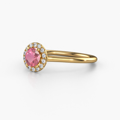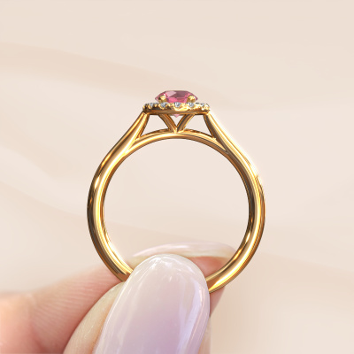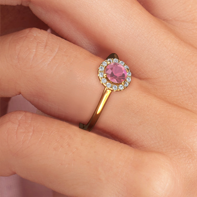 The ring shown above is called the Seline rnd 1. We call this type of ring a halo ring because it has one centre gemstone and a band that is also pave set with gemstones. The 14 Carat gold engagement ring is set with a round 5 mm tourmaline pink centre stone and the band is pave set with diamonds. What makes this classic gold halo ring special are the smaller sized stones embracing the centre stone. This gorgeous engagement ring is called a halo ring because the smaller gemstones give the centre stone a halo of surrounding light. In order for the smaller stones to enhance the centre stone, they have to be placed so there is no interference of light. And that's when our expert goldsmiths come in. Each individual stone is carefully set in the ring by hand. During manufacturing, light fall is constantly monitored to make sure the special halo is still visible. In the end you get a unique engagement ring, with a tourmaline pink of your choosing at its centre. You can imagine the effect of a ring of such significance when you give it to her on her special day to shine. By using our modern techniques, we can design and customize the finest quality jewels with the utmost care for you. Our engagement rings are always priced 30 percent lower than other jewellers. We make engagement rings to order so we don't have to maintain a large stock. If you have a certain budget, we are more than happy to advice you accordingly.Different styles of new rings are made daily by our team. Perhaps you have found a halo engagement ring somewhere. One you would like to give to your loved one. Please feel free to share your thoughts and design with our jewel designers. We would love to turn your design into a classic engagement ring. You can follow the development of your ring design because we use very detailed 3D drawings. On top of that, you can order a dummy of the design. A dummy is a plastic ring, which can be shaped according your ring design. You can try it on and check if the engagement ring is up to standard. We will gladly send you a non-binding offer, based on a fair price/ quality ratio. The offer will baffle you, considering the quality of the ring and gemstones.To make it easier for you, we offer a 30 day return policy. Check our terms and conditions.