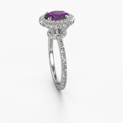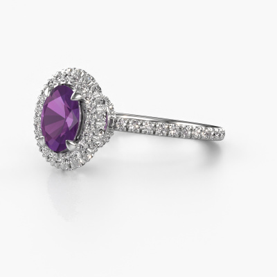 The ring shown above is called the Talitha OVL. We call this type of ring a halo ring because it has one centre gemstone and a band that is also pave set with gemstones. The platinum engagement ring is set with a oval 7x5 mm amethyst centre stone and the band is pave set with lab-grown diamonds. What makes this classic platinum halo ring special are the smaller sized stones embracing the centre stone. This gorgeous engagement ring is called a halo ring because the smaller gemstones give the centre stone a halo of surrounding light. In order for the smaller stones to enhance the centre stone, they have to be placed so there is no interference of light. And that's when our expert goldsmiths come in. Each individual stone is carefully set in the ring by hand. During manufacturing, light fall is constantly monitored to make sure the special halo is still visible. In the end you get a unique engagement ring, with a amethyst of your choosing at its centre. You can imagine the effect of a ring of such significance when you give it to her on her special day to shine. By using a combination of the latest modern techniques, combined with ancient crafting, we can make all our engagement rings in our own studio. Each jewel is made to order. This is advantageous because we can offer you a price you won't find anywhere else.Our designers and goldsmiths work together each day, creating new jewels. Perhaps you have found a nice classic engagement ring somewhere, which can be used to customize your unique ring. Please feel free to contact us. We will make you an offer, based on a fair price/ quality ratio, which will amaze you.To make it easier for you, we offer a 30 day return policy. Check our terms and conditions.