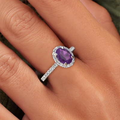 The ring shown above is called the Miranda ovl. We call this type of ring a halo ring because it has one centre gemstone and a band that is also pave set with gemstones. The platinum engagement ring is set with a oval 8x6 mm amethyst centre stone and the band is pave set with lab-grown diamonds. What makes this exclusive platinum halo ring special are the smaller sized stones embracing the centre stone. This gorgeous engagement ring is called a halo ring because the smaller gemstones give the centre stone a halo of surrounding light. In order for the smaller stones to enhance the centre stone, they have to be placed so there is no interference of light. And that's when our expert goldsmiths come in. Each individual stone is carefully set in the ring by hand. During manufacturing, light fall is constantly monitored to make sure the special halo is still visible. In the end you get a unique engagement ring, with a amethyst of your choosing at its centre. You can imagine the effect of a ring of such significance when you give it to her on her special day to shine. By using a combination of the latest modern techniques, combined with ancient crafting, we can make all our engagement rings in our own studio. Each jewel is made to order. This is advantageous because we can offer you a price you won't find anywhere else.Our designers and goldsmiths work together each day, creating new jewels. Perhaps you have found a nice exclusive engagement ring somewhere, which can be used to customize your unique ring. Please feel free to contact us. We will make you an offer, based on a fair price/ quality ratio, which will amaze you.To make it easier for you, we offer a 30 day return policy. Check our terms and conditions.