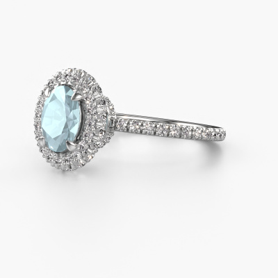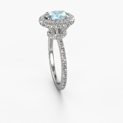 The ring shown above is called the Talitha OVL. We call this type of ring a halo ring because it has one centre gemstone and a band that is also pave set with gemstones. The platinum engagement ring is set with a oval 7x5 mm aquamarine centre stone and the band is pave set with lab-grown diamonds. What makes this classic platinum halo ring special are the smaller sized stones embracing the centre stone. This gorgeous engagement ring is called a halo ring because the smaller gemstones give the centre stone a halo of surrounding light. In order for the smaller stones to enhance the centre stone, they have to be placed so there is no interference of light. And that's when our expert goldsmiths come in. Each individual stone is carefully set in the ring by hand. During manufacturing, light fall is constantly monitored to make sure the special halo is still visible. In the end you get a unique engagement ring, with a aquamarine of your choosing at its centre. You can imagine the effect of a ring of such significance when you give it to her on her special day to shine. By using a combination of the latest modern techniques, combined with ancient crafting, we can make all our engagement rings in our own studio. Each jewel is made to order. This is advantageous because we can offer you a price you won't find anywhere else.Our designers and goldsmiths work together each day, creating new jewels. Perhaps you have found a nice classic engagement ring somewhere, which can be used to customize your unique ring. Please feel free to contact us. We will make you an offer, based on a fair price/ quality ratio, which will amaze you.To make it easier for you, we offer a 30 day return policy. Check our terms and conditions.