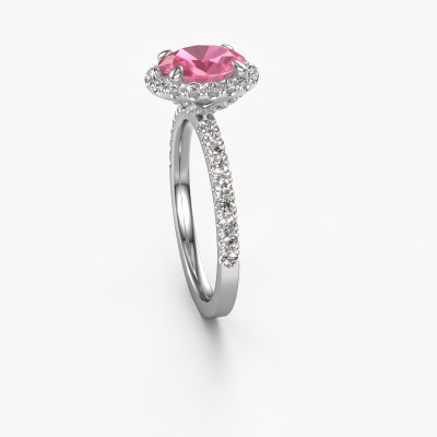 The ring shown above is called the Miranda ovl. We call this type of ring a halo ring because it has one centre gemstone and a band that is also pave set with gemstones. The platinum engagement ring is set with a oval 8x6 mm pink sapphire centre stone and the band is pave set with lab-grown diamonds. What makes this exclusive platinum halo ring special are the smaller sized stones embracing the centre stone. This gorgeous engagement ring is called a halo ring because the smaller gemstones give the centre stone a halo of surrounding light. In order for the smaller stones to enhance the centre stone, they have to be placed so there is no interference of light. And that's when our expert goldsmiths come in. Each individual stone is carefully set in the ring by hand. During manufacturing, light fall is constantly monitored to make sure the special halo is still visible. In the end you get a unique engagement ring, with a pink sapphire of your choosing at its centre. You can imagine the effect of a ring of such significance when you give it to her on her special day to shine. By using a combination of the latest modern techniques, combined with ancient crafting, we can make all our engagement rings in our own studio. Each jewel is made to order. This is advantageous because we can offer you a price you won't find anywhere else.Our designers and goldsmiths work together each day, creating new jewels. Perhaps you have found a nice exclusive engagement ring somewhere, which can be used to customize your unique ring. Please feel free to contact us. We will make you an offer, based on a fair price/ quality ratio, which will amaze you.To make it easier for you, we offer a 30 day return policy. Check our terms and conditions.