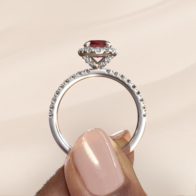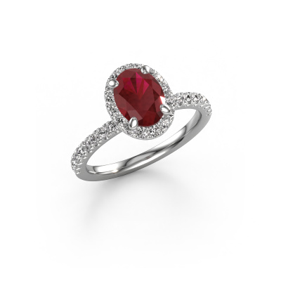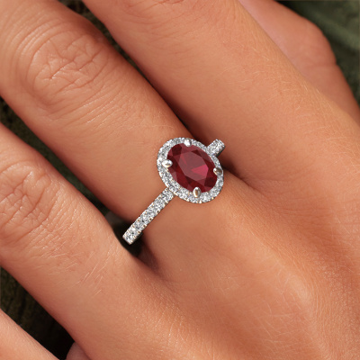 The ring shown above is called the Miranda ovl. We call this type of ring a halo ring because it has one centre gemstone and a band that is also pave set with gemstones. The platinum engagement ring is set with a oval 8x6 mm ruby centre stone and the band is pave set with lab-grown diamonds. What makes this exclusive platinum halo ring special are the smaller sized stones embracing the centre stone. This gorgeous engagement ring is called a halo ring because the smaller gemstones give the centre stone a halo of surrounding light. In order for the smaller stones to enhance the centre stone, they have to be placed so there is no interference of light. And that's when our expert goldsmiths come in. Each individual stone is carefully set in the ring by hand. During manufacturing, light fall is constantly monitored to make sure the special halo is still visible. In the end you get a unique engagement ring, with a ruby of your choosing at its centre. You can imagine the effect of a ring of such significance when you give it to her on her special day to shine. By using a combination of the latest modern techniques, combined with ancient crafting, we can make all our engagement rings in our own studio. Each jewel is made to order. This is advantageous because we can offer you a price you won't find anywhere else.Our designers and goldsmiths work together each day, creating new jewels. Perhaps you have found a nice exclusive engagement ring somewhere, which can be used to customize your unique ring. Please feel free to contact us. We will make you an offer, based on a fair price/ quality ratio, which will amaze you.To make it easier for you, we offer a 30 day return policy. Check our terms and conditions.