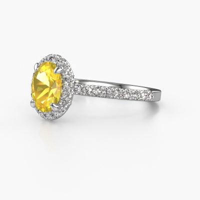 The ring shown above is called the Miranda ovl. We call this type of ring a halo ring because it has one centre gemstone and a band that is also pave set with gemstones. The platinum engagement ring is set with a oval 8x6 mm yellow sapphire centre stone and the band is pave set with lab-grown diamonds. What makes this exclusive platinum halo ring special are the smaller sized stones embracing the centre stone. This gorgeous engagement ring is called a halo ring because the smaller gemstones give the centre stone a halo of surrounding light. In order for the smaller stones to enhance the centre stone, they have to be placed so there is no interference of light. And that's when our expert goldsmiths come in. Each individual stone is carefully set in the ring by hand. During manufacturing, light fall is constantly monitored to make sure the special halo is still visible. In the end you get a unique engagement ring, with a yellow sapphire of your choosing at its centre. You can imagine the effect of a ring of such significance when you give it to her on her special day to shine. By using a combination of the latest modern techniques, combined with ancient crafting, we can make all our engagement rings in our own studio. Each jewel is made to order. This is advantageous because we can offer you a price you won't find anywhere else.Our designers and goldsmiths work together each day, creating new jewels. Perhaps you have found a nice exclusive engagement ring somewhere, which can be used to customize your unique ring. Please feel free to contact us. We will make you an offer, based on a fair price/ quality ratio, which will amaze you.To make it easier for you, we offer a 30 day return policy. Check our terms and conditions.