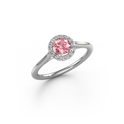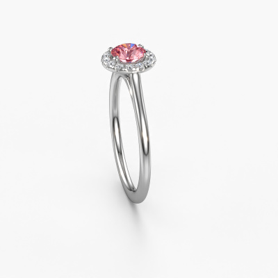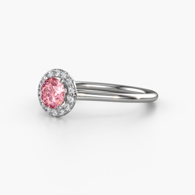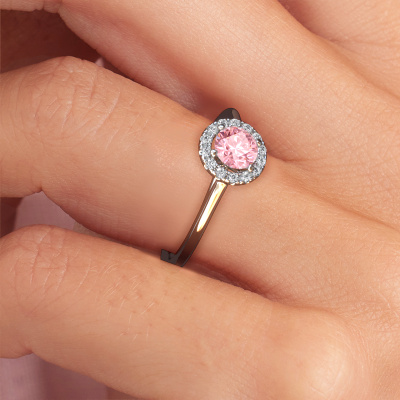 The ring shown above is called the Seline rnd 1. We call this type of ring a halo ring because it has one centre gemstone and a band that is also pave set with gemstones. The platinum engagement ring is set with a round 5 mm pink lab grown diamond centre stone and the band is pave set with diamonds. What makes this classic platinum halo ring special are the smaller sized stones embracing the centre stone. This gorgeous engagement ring is called a halo ring because the smaller gemstones give the centre stone a halo of surrounding light. In order for the smaller stones to enhance the centre stone, they have to be placed so there is no interference of light. And that's when our expert goldsmiths come in. Each individual stone is carefully set in the ring by hand. During manufacturing, light fall is constantly monitored to make sure the special halo is still visible. In the end you get a unique engagement ring, with a pink lab grown diamond of your choosing at its centre. You can imagine the effect of a ring of such significance when you give it to her on her special day to shine. By using our modern techniques, we can design and customize the finest quality jewels with the utmost care for you. Our engagement rings are always priced 30 percent lower than other jewellers. We make engagement rings to order so we don't have to maintain a large stock. If you have a certain budget, we are more than happy to advice you accordingly.Different styles of new rings are made daily by our team. Perhaps you have found a halo engagement ring somewhere. One you would like to give to your loved one. Please feel free to share your thoughts and design with our jewel designers. We would love to turn your design into a classic engagement ring. You can follow the development of your ring design because we use very detailed 3D drawings. On top of that, you can order a dummy of the design. A dummy is a plastic ring, which can be shaped according your ring design. You can try it on and check if the engagement ring is up to standard. We will gladly send you a non-binding offer, based on a fair price/ quality ratio. The offer will baffle you, considering the quality of the ring and gemstones.To make it easier for you, we offer a 30 day return policy. Check our terms and conditions.