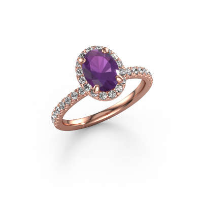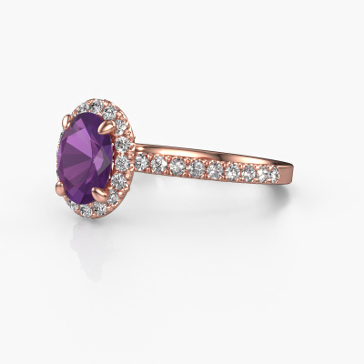 The ring shown above is called the Miranda ovl. We call this type of ring a halo ring because it has one centre gemstone and a band that is also pave set with gemstones. The 14 Carat rose gold engagement ring is set with a oval 8x6 mm amethyst centre stone and the band is pave set with lab-grown diamonds. What makes this exclusive rose gold halo ring special are the smaller sized stones embracing the centre stone. This gorgeous engagement ring is called a halo ring because the smaller gemstones give the centre stone a halo of surrounding light. In order for the smaller stones to enhance the centre stone, they have to be placed so there is no interference of light. And that's when our expert goldsmiths come in. Each individual stone is carefully set in the ring by hand. During manufacturing, light fall is constantly monitored to make sure the special halo is still visible. In the end you get a unique engagement ring, with a amethyst of your choosing at its centre. You can imagine the effect of a ring of such significance when you give it to her on her special day to shine. By using a combination of the latest modern techniques, combined with ancient crafting, we can make all our engagement rings in our own studio. Each jewel is made to order. This is advantageous because we can offer you a price you won't find anywhere else.Our designers and goldsmiths work together each day, creating new jewels. Perhaps you have found a nice exclusive engagement ring somewhere, which can be used to customize your unique ring. Please feel free to contact us. We will make you an offer, based on a fair price/ quality ratio, which will amaze you.To make it easier for you, we offer a 30 day return policy. Check our terms and conditions.