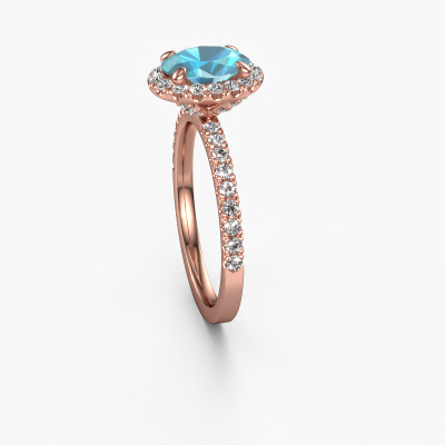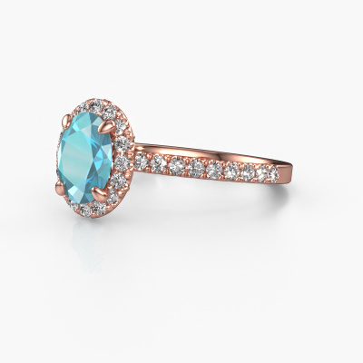 The ring shown above is called the Miranda ovl. We call this type of ring a halo ring because it has one centre gemstone and a band that is also pave set with gemstones. The 14 Carat rose gold engagement ring is set with a oval 8x6 mm blue topaz centre stone and the band is pave set with lab-grown diamonds. What makes this exclusive rose gold halo ring special are the smaller sized stones embracing the centre stone. This gorgeous engagement ring is called a halo ring because the smaller gemstones give the centre stone a halo of surrounding light. In order for the smaller stones to enhance the centre stone, they have to be placed so there is no interference of light. And that's when our expert goldsmiths come in. Each individual stone is carefully set in the ring by hand. During manufacturing, light fall is constantly monitored to make sure the special halo is still visible. In the end you get a unique engagement ring, with a blue topaz of your choosing at its centre. You can imagine the effect of a ring of such significance when you give it to her on her special day to shine. By using a combination of the latest modern techniques, combined with ancient crafting, we can make all our engagement rings in our own studio. Each jewel is made to order. This is advantageous because we can offer you a price you won't find anywhere else.Our designers and goldsmiths work together each day, creating new jewels. Perhaps you have found a nice exclusive engagement ring somewhere, which can be used to customize your unique ring. Please feel free to contact us. We will make you an offer, based on a fair price/ quality ratio, which will amaze you.To make it easier for you, we offer a 30 day return policy. Check our terms and conditions.