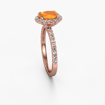 The ring shown above is called the Miranda ovl. We call this type of ring a halo ring because it has one centre gemstone and a band that is also pave set with gemstones. The 14 Carat rose gold engagement ring is set with a oval 8x6 mm citrin centre stone and the band is pave set with lab-grown diamonds. What makes this exclusive rose gold halo ring special are the smaller sized stones embracing the centre stone. This gorgeous engagement ring is called a halo ring because the smaller gemstones give the centre stone a halo of surrounding light. In order for the smaller stones to enhance the centre stone, they have to be placed so there is no interference of light. And that's when our expert goldsmiths come in. Each individual stone is carefully set in the ring by hand. During manufacturing, light fall is constantly monitored to make sure the special halo is still visible. In the end you get a unique engagement ring, with a citrin of your choosing at its centre. You can imagine the effect of a ring of such significance when you give it to her on her special day to shine. By using a combination of the latest modern techniques, combined with ancient crafting, we can make all our engagement rings in our own studio. Each jewel is made to order. This is advantageous because we can offer you a price you won't find anywhere else.Our designers and goldsmiths work together each day, creating new jewels. Perhaps you have found a nice exclusive engagement ring somewhere, which can be used to customize your unique ring. Please feel free to contact us. We will make you an offer, based on a fair price/ quality ratio, which will amaze you.To make it easier for you, we offer a 30 day return policy. Check our terms and conditions.