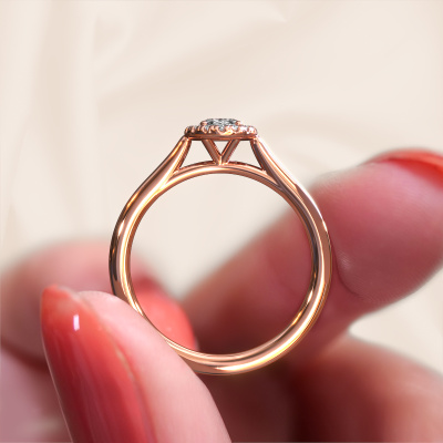 The ring shown above is called the Seline ovl 1. We call this type of ring a halo ring because it has one centre gemstone and a band that is also pave set with gemstones. The 14 Carat rose gold engagement ring is set with a oval 0.35 crt diamond centre stone and the band is pave set with diamonds. What makes this classic rose gold halo ring special are the smaller sized stones embracing the centre stone. This gorgeous engagement ring is called a halo ring because the smaller gemstones give the centre stone a halo of surrounding light. In order for the smaller stones to enhance the centre stone, they have to be placed so there is no interference of light. And that's when our expert goldsmiths come in. Each individual stone is carefully set in the ring by hand. During manufacturing, light fall is constantly monitored to make sure the special halo is still visible. In the end you get a unique engagement ring, with a diamond of your choosing at its centre. You can imagine the effect of a ring of such significance when you give it to her on her special day to shine. Are you on a budget? Please feel free to contact us, so we can go discuss your options. We offer our engagement rings at guaranteed best price, because we make them to order. You won't find such a price anywhere else!Our team adds new designs to our online collection daily. Our designers and goldsmiths work together in creating the best design. We strive to offer a diverse collection of jewels. Perhaps you have a specific jewel design in mind. One you came across somewhere. Please contact us for a free consultation. We will make you an offer, based on a fair price/ quality ratio, that will baffle you.To make it easier for you, we offer a 30 day return policy. Check our terms and conditions.