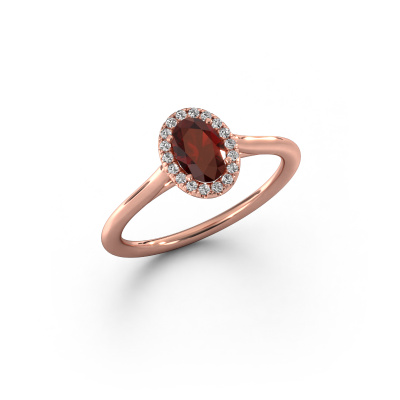 The ring shown above is called the Seline ovl 1. We call this type of ring a halo ring because it has one centre gemstone and a band that is also pave set with gemstones. The 14 Carat rose gold engagement ring is set with a oval 6x4 mm garnet centre stone and the band is pave set with diamonds. What makes this classic rose gold halo ring special are the smaller sized stones embracing the centre stone. This gorgeous engagement ring is called a halo ring because the smaller gemstones give the centre stone a halo of surrounding light. In order for the smaller stones to enhance the centre stone, they have to be placed so there is no interference of light. And that's when our expert goldsmiths come in. Each individual stone is carefully set in the ring by hand. During manufacturing, light fall is constantly monitored to make sure the special halo is still visible. In the end you get a unique engagement ring, with a garnet of your choosing at its centre. You can imagine the effect of a ring of such significance when you give it to her on her special day to shine. Are you on a budget? Please feel free to contact us, so we can go discuss your options. We offer our engagement rings at guaranteed best price, because we make them to order. You won't find such a price anywhere else!Our team adds new designs to our online collection daily. Our designers and goldsmiths work together in creating the best design. We strive to offer a diverse collection of jewels. Perhaps you have a specific jewel design in mind. One you came across somewhere. Please contact us for a free consultation. We will make you an offer, based on a fair price/ quality ratio, that will baffle you.To make it easier for you, we offer a 30 day return policy. Check our terms and conditions.