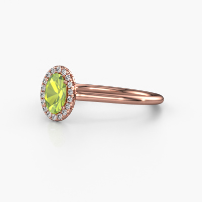 The ring shown above is called the Seline ovl 1. We call this type of ring a halo ring because it has one centre gemstone and a band that is also pave set with gemstones. The 14 Carat rose gold engagement ring is set with a oval 6x4 mm peridot centre stone and the band is pave set with diamonds. What makes this classic rose gold halo ring special are the smaller sized stones embracing the centre stone. This gorgeous engagement ring is called a halo ring because the smaller gemstones give the centre stone a halo of surrounding light. In order for the smaller stones to enhance the centre stone, they have to be placed so there is no interference of light. And that's when our expert goldsmiths come in. Each individual stone is carefully set in the ring by hand. During manufacturing, light fall is constantly monitored to make sure the special halo is still visible. In the end you get a unique engagement ring, with a peridot of your choosing at its centre. You can imagine the effect of a ring of such significance when you give it to her on her special day to shine. Are you on a budget? Please feel free to contact us, so we can go discuss your options. We offer our engagement rings at guaranteed best price, because we make them to order. You won't find such a price anywhere else!Our team adds new designs to our online collection daily. Our designers and goldsmiths work together in creating the best design. We strive to offer a diverse collection of jewels. Perhaps you have a specific jewel design in mind. One you came across somewhere. Please contact us for a free consultation. We will make you an offer, based on a fair price/ quality ratio, that will baffle you.To make it easier for you, we offer a 30 day return policy. Check our terms and conditions.