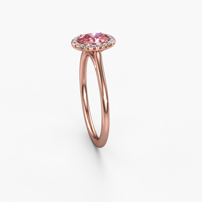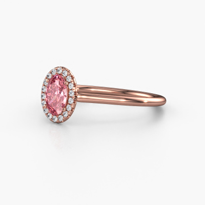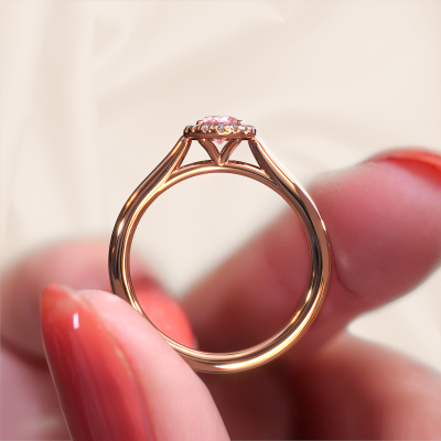 The ring shown above is called the Seline ovl 1. We call this type of ring a halo ring because it has one centre gemstone and a band that is also pave set with gemstones. The 14 Carat rose gold engagement ring is set with a oval 6x4 mm pink lab grown diamond centre stone and the band is pave set with diamonds. What makes this classic rose gold halo ring special are the smaller sized stones embracing the centre stone. This gorgeous engagement ring is called a halo ring because the smaller gemstones give the centre stone a halo of surrounding light. In order for the smaller stones to enhance the centre stone, they have to be placed so there is no interference of light. And that's when our expert goldsmiths come in. Each individual stone is carefully set in the ring by hand. During manufacturing, light fall is constantly monitored to make sure the special halo is still visible. In the end you get a unique engagement ring, with a pink lab grown diamond of your choosing at its centre. You can imagine the effect of a ring of such significance when you give it to her on her special day to shine. Are you on a budget? Please feel free to contact us, so we can go discuss your options. We offer our engagement rings at guaranteed best price, because we make them to order. You won't find such a price anywhere else!Our team adds new designs to our online collection daily. Our designers and goldsmiths work together in creating the best design. We strive to offer a diverse collection of jewels. Perhaps you have a specific jewel design in mind. One you came across somewhere. Please contact us for a free consultation. We will make you an offer, based on a fair price/ quality ratio, that will baffle you.To make it easier for you, we offer a 30 day return policy. Check our terms and conditions.