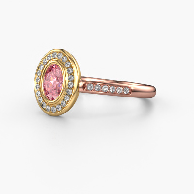 The ring shown above is called the Noud 2 OVL. We call this type of ring a halo ring because it has one centre gemstone and a band that is also pave set with gemstones. The 14 Carat rose gold engagement ring is set with a oval 6x4 mm pink lab grown diamond centre stone and the band is pave set with lab-grown diamonds. What makes this exclusive rose gold halo ring special are the smaller sized stones embracing the centre stone. This gorgeous engagement ring is called a halo ring because the smaller gemstones give the centre stone a halo of surrounding light. In order for the smaller stones to enhance the centre stone, they have to be placed so there is no interference of light. And that's when our expert goldsmiths come in. Each individual stone is carefully set in the ring by hand. During manufacturing, light fall is constantly monitored to make sure the special halo is still visible. In the end you get a unique engagement ring, with a pink lab grown diamond of your choosing at its centre. You can imagine the effect of a ring of such significance when you give it to her on her special day to shine. By using our modern techniques, we can design and customize the finest quality jewels with the utmost care for you. Our engagement rings are always priced 30 percent lower than other jewellers. We make engagement rings to order so we don't have to maintain a large stock. If you have a certain budget, we are more than happy to advice you accordingly.Have you found a specific engagement ring somewhere which you would like to give to your loved one? Please feel free to express your wishes to our jewel designers because we would be honoured to turn your design into a exclusive engagement ring. You can follow the development of your ring design because we use 3D drawings. This gives you a realistic preview of how your design will look. You can also preorder a dummy. A dummy is a plastic ring, which can be shaped according your ring design. You can try it on and check if its width and size are suitable for you. We will gladly send you a non-binding offer, based on a fair price/ quality ratio. It will amaze you, considering the quality of the ring and gemstones.To make it easier for you, we offer a 30 day return policy. Check our terms and conditions.