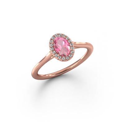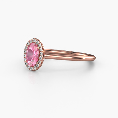 The ring shown above is called the Seline ovl 1. We call this type of ring a halo ring because it has one centre gemstone and a band that is also pave set with gemstones. The 14 Carat rose gold engagement ring is set with a oval 6x4 mm pink sapphire centre stone and the band is pave set with diamonds. What makes this classic rose gold halo ring special are the smaller sized stones embracing the centre stone. This gorgeous engagement ring is called a halo ring because the smaller gemstones give the centre stone a halo of surrounding light. In order for the smaller stones to enhance the centre stone, they have to be placed so there is no interference of light. And that's when our expert goldsmiths come in. Each individual stone is carefully set in the ring by hand. During manufacturing, light fall is constantly monitored to make sure the special halo is still visible. In the end you get a unique engagement ring, with a pink sapphire of your choosing at its centre. You can imagine the effect of a ring of such significance when you give it to her on her special day to shine. Are you on a budget? Please feel free to contact us, so we can go discuss your options. We offer our engagement rings at guaranteed best price, because we make them to order. You won't find such a price anywhere else!Our team adds new designs to our online collection daily. Our designers and goldsmiths work together in creating the best design. We strive to offer a diverse collection of jewels. Perhaps you have a specific jewel design in mind. One you came across somewhere. Please contact us for a free consultation. We will make you an offer, based on a fair price/ quality ratio, that will baffle you.To make it easier for you, we offer a 30 day return policy. Check our terms and conditions.