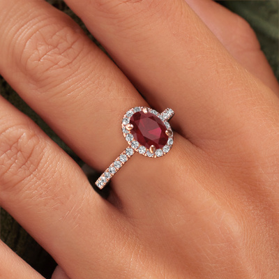 The ring shown above is called the Miranda ovl. We call this type of ring a halo ring because it has one centre gemstone and a band that is also pave set with gemstones. The 14 Carat rose gold engagement ring is set with a oval 8x6 mm ruby centre stone and the band is pave set with lab-grown diamonds. What makes this exclusive rose gold halo ring special are the smaller sized stones embracing the centre stone. This gorgeous engagement ring is called a halo ring because the smaller gemstones give the centre stone a halo of surrounding light. In order for the smaller stones to enhance the centre stone, they have to be placed so there is no interference of light. And that's when our expert goldsmiths come in. Each individual stone is carefully set in the ring by hand. During manufacturing, light fall is constantly monitored to make sure the special halo is still visible. In the end you get a unique engagement ring, with a ruby of your choosing at its centre. You can imagine the effect of a ring of such significance when you give it to her on her special day to shine. By using a combination of the latest modern techniques, combined with ancient crafting, we can make all our engagement rings in our own studio. Each jewel is made to order. This is advantageous because we can offer you a price you won't find anywhere else.Our designers and goldsmiths work together each day, creating new jewels. Perhaps you have found a nice exclusive engagement ring somewhere, which can be used to customize your unique ring. Please feel free to contact us. We will make you an offer, based on a fair price/ quality ratio, which will amaze you.To make it easier for you, we offer a 30 day return policy. Check our terms and conditions.