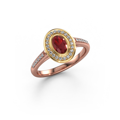 The ring shown above is called the Noud 2 OVL. We call this type of ring a halo ring because it has one centre gemstone and a band that is also pave set with gemstones. The 14 Carat rose gold engagement ring is set with a oval 6x4 mm ruby centre stone and the band is pave set with lab-grown diamonds. What makes this exclusive rose gold halo ring special are the smaller sized stones embracing the centre stone. This gorgeous engagement ring is called a halo ring because the smaller gemstones give the centre stone a halo of surrounding light. In order for the smaller stones to enhance the centre stone, they have to be placed so there is no interference of light. And that's when our expert goldsmiths come in. Each individual stone is carefully set in the ring by hand. During manufacturing, light fall is constantly monitored to make sure the special halo is still visible. In the end you get a unique engagement ring, with a ruby of your choosing at its centre. You can imagine the effect of a ring of such significance when you give it to her on her special day to shine. By using our modern techniques, we can design and customize the finest quality jewels with the utmost care for you. Our engagement rings are always priced 30 percent lower than other jewellers. We make engagement rings to order so we don't have to maintain a large stock. If you have a certain budget, we are more than happy to advice you accordingly.Have you found a specific engagement ring somewhere which you would like to give to your loved one? Please feel free to express your wishes to our jewel designers because we would be honoured to turn your design into a exclusive engagement ring. You can follow the development of your ring design because we use 3D drawings. This gives you a realistic preview of how your design will look. You can also preorder a dummy. A dummy is a plastic ring, which can be shaped according your ring design. You can try it on and check if its width and size are suitable for you. We will gladly send you a non-binding offer, based on a fair price/ quality ratio. It will amaze you, considering the quality of the ring and gemstones.To make it easier for you, we offer a 30 day return policy. Check our terms and conditions.