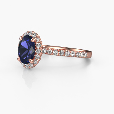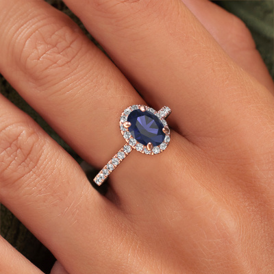 The ring shown above is called the Miranda ovl. We call this type of ring a halo ring because it has one centre gemstone and a band that is also pave set with gemstones. The 14 Carat rose gold engagement ring is set with a oval 8x6 mm sapphire centre stone and the band is pave set with lab-grown diamonds. What makes this exclusive rose gold halo ring special are the smaller sized stones embracing the centre stone. This gorgeous engagement ring is called a halo ring because the smaller gemstones give the centre stone a halo of surrounding light. In order for the smaller stones to enhance the centre stone, they have to be placed so there is no interference of light. And that's when our expert goldsmiths come in. Each individual stone is carefully set in the ring by hand. During manufacturing, light fall is constantly monitored to make sure the special halo is still visible. In the end you get a unique engagement ring, with a sapphire of your choosing at its centre. You can imagine the effect of a ring of such significance when you give it to her on her special day to shine. By using a combination of the latest modern techniques, combined with ancient crafting, we can make all our engagement rings in our own studio. Each jewel is made to order. This is advantageous because we can offer you a price you won't find anywhere else.Our designers and goldsmiths work together each day, creating new jewels. Perhaps you have found a nice exclusive engagement ring somewhere, which can be used to customize your unique ring. Please feel free to contact us. We will make you an offer, based on a fair price/ quality ratio, which will amaze you.To make it easier for you, we offer a 30 day return policy. Check our terms and conditions.