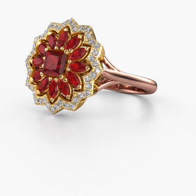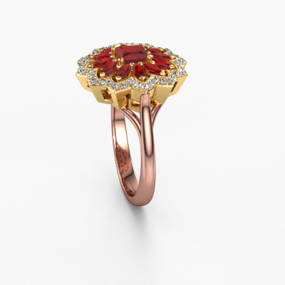 This 14 Carat rose gold ring is called Franka and is set with 4 mm ruby. Is your girlfriend hooked on vintage? Then this rose gold daring engagement ring will surely match her style perfectly. A trendy ring with just a hint of vintage adornment. A truly stunning, romantic design! Especially when you customize your ring to your own liking. This vintage halo engagement ring is set with stunning ruby. As you can see, you are the boss in selecting a gemstone which matches the style of your girlfriend best. Each gemstone is carefully selected by our merchants whom are spread throughout the world. Nothing but the best gems for our expert goldsmith. After all, it is his crowning glory! Each jewel is made just for you by our master goldsmiths in our own studio.By using a combination of the latest modern techniques, combined with ancient crafting, we can make all our engagement rings in our own studio. Each jewel is made to order. This is advantageous because we can offer you a price you won't find anywhere else.Our designers and goldsmiths work together each day, creating new jewels. Perhaps you have found a nice vintage engagement ring somewhere, which can be used to customize your unique ring. Please feel free to contact us. We will make you an offer, based on a fair price/ quality ratio, which will amaze you.To make it easier for you, we offer a 30 day return policy. Check our terms and conditions.
