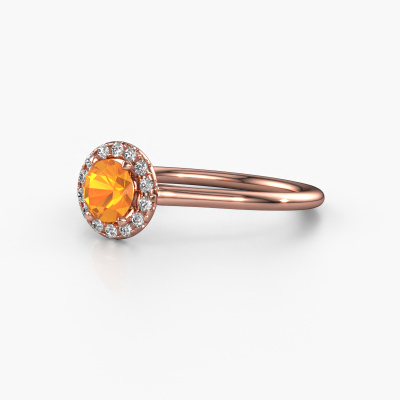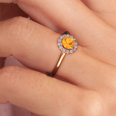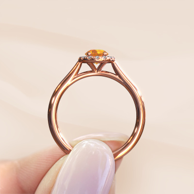 The ring shown above is called the Seline rnd 1. We call this type of ring a halo ring because it has one centre gemstone and a band that is also pave set with gemstones. The 14 Carat rose gold engagement ring is set with a round 5 mm citrin centre stone and the band is pave set with diamonds. What makes this classic rose gold halo ring special are the smaller sized stones embracing the centre stone. This gorgeous engagement ring is called a halo ring because the smaller gemstones give the centre stone a halo of surrounding light. In order for the smaller stones to enhance the centre stone, they have to be placed so there is no interference of light. And that's when our expert goldsmiths come in. Each individual stone is carefully set in the ring by hand. During manufacturing, light fall is constantly monitored to make sure the special halo is still visible. In the end you get a unique engagement ring, with a citrin of your choosing at its centre. You can imagine the effect of a ring of such significance when you give it to her on her special day to shine. By using our modern techniques, we can design and customize the finest quality jewels with the utmost care for you. Our engagement rings are always priced 30 percent lower than other jewellers. We make engagement rings to order so we don't have to maintain a large stock. If you have a certain budget, we are more than happy to advice you accordingly.Different styles of new rings are made daily by our team. Perhaps you have found a halo engagement ring somewhere. One you would like to give to your loved one. Please feel free to share your thoughts and design with our jewel designers. We would love to turn your design into a classic engagement ring. You can follow the development of your ring design because we use very detailed 3D drawings. On top of that, you can order a dummy of the design. A dummy is a plastic ring, which can be shaped according your ring design. You can try it on and check if the engagement ring is up to standard. We will gladly send you a non-binding offer, based on a fair price/ quality ratio. The offer will baffle you, considering the quality of the ring and gemstones.To make it easier for you, we offer a 30 day return policy. Check our terms and conditions.