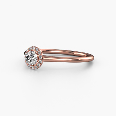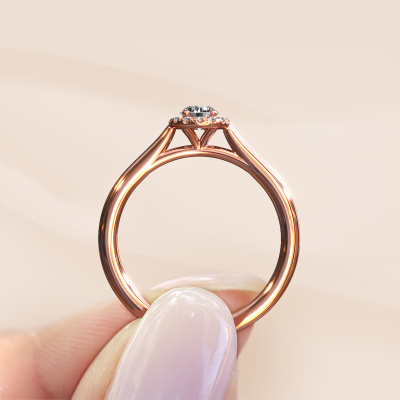The ring shown above is called the Seline rnd 1. We call this type of ring a halo ring because it has one centre gemstone and a band that is also pave set with gemstones. The 14 Carat rose gold engagement ring is set with a round 0.25 crt diamond centre stone and the band is pave set with diamonds. What makes this classic rose gold halo ring special are the smaller sized stones embracing the centre stone. This gorgeous engagement ring is called a halo ring because the smaller gemstones give the centre stone a halo of surrounding light. In order for the smaller stones to enhance the centre stone, they have to be placed so there is no interference of light. And that's when our expert goldsmiths come in. Each individual stone is carefully set in the ring by hand. During manufacturing, light fall is constantly monitored to make sure the special halo is still visible. In the end you get a unique engagement ring, with a diamond of your choosing at its centre. You can imagine the effect of a ring of such significance when you give it to her on her special day to shine. By using our modern techniques, we can design and customize the finest quality jewels with the utmost care for you. Our engagement rings are always priced 30 percent lower than other jewellers. We make engagement rings to order so we don't have to maintain a large stock. If you have a certain budget, we are more than happy to advice you accordingly.Different styles of new rings are made daily by our team. Perhaps you have found a halo engagement ring somewhere. One you would like to give to your loved one. Please feel free to share your thoughts and design with our jewel designers. We would love to turn your design into a classic engagement ring. You can follow the development of your ring design because we use very detailed 3D drawings. On top of that, you can order a dummy of the design. A dummy is a plastic ring, which can be shaped according your ring design. You can try it on and check if the engagement ring is up to standard. We will gladly send you a non-binding offer, based on a fair price/ quality ratio. The offer will baffle you, considering the quality of the ring and gemstones.To make it easier for you, we offer a 30 day return policy. Check our terms and conditions.