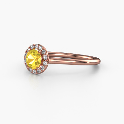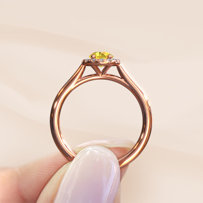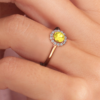 The ring shown above is called the Seline rnd 1. We call this type of ring a halo ring because it has one centre gemstone and a band that is also pave set with gemstones. The 14 Carat rose gold engagement ring is set with a round 5 mm yellow sapphire centre stone and the band is pave set with diamonds. What makes this classic rose gold halo ring special are the smaller sized stones embracing the centre stone. This gorgeous engagement ring is called a halo ring because the smaller gemstones give the centre stone a halo of surrounding light. In order for the smaller stones to enhance the centre stone, they have to be placed so there is no interference of light. And that's when our expert goldsmiths come in. Each individual stone is carefully set in the ring by hand. During manufacturing, light fall is constantly monitored to make sure the special halo is still visible. In the end you get a unique engagement ring, with a yellow sapphire of your choosing at its centre. You can imagine the effect of a ring of such significance when you give it to her on her special day to shine. By using our modern techniques, we can design and customize the finest quality jewels with the utmost care for you. Our engagement rings are always priced 30 percent lower than other jewellers. We make engagement rings to order so we don't have to maintain a large stock. If you have a certain budget, we are more than happy to advice you accordingly.Different styles of new rings are made daily by our team. Perhaps you have found a halo engagement ring somewhere. One you would like to give to your loved one. Please feel free to share your thoughts and design with our jewel designers. We would love to turn your design into a classic engagement ring. You can follow the development of your ring design because we use very detailed 3D drawings. On top of that, you can order a dummy of the design. A dummy is a plastic ring, which can be shaped according your ring design. You can try it on and check if the engagement ring is up to standard. We will gladly send you a non-binding offer, based on a fair price/ quality ratio. The offer will baffle you, considering the quality of the ring and gemstones.To make it easier for you, we offer a 30 day return policy. Check our terms and conditions.