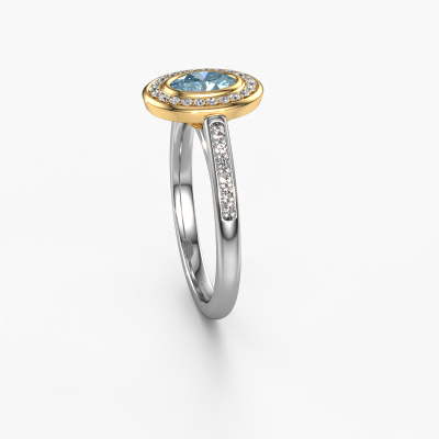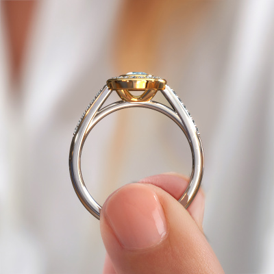 The ring shown above is called the Noud 2 OVL. We call this type of ring a halo ring because it has one centre gemstone and a band that is also pave set with gemstones. The 14 Carat white gold engagement ring is set with a oval 6x4 mm blue lab grown diamond centre stone and the band is pave set with lab-grown diamonds. What makes this exclusive white gold halo ring special are the smaller sized stones embracing the centre stone. This gorgeous engagement ring is called a halo ring because the smaller gemstones give the centre stone a halo of surrounding light. In order for the smaller stones to enhance the centre stone, they have to be placed so there is no interference of light. And that's when our expert goldsmiths come in. Each individual stone is carefully set in the ring by hand. During manufacturing, light fall is constantly monitored to make sure the special halo is still visible. In the end you get a unique engagement ring, with a blue lab grown diamond of your choosing at its centre. You can imagine the effect of a ring of such significance when you give it to her on her special day to shine. By using our modern techniques, we can design and customize the finest quality jewels with the utmost care for you. Our engagement rings are always priced 30 percent lower than other jewellers. We make engagement rings to order so we don't have to maintain a large stock. If you have a certain budget, we are more than happy to advice you accordingly.Have you found a specific engagement ring somewhere which you would like to give to your loved one? Please feel free to express your wishes to our jewel designers because we would be honoured to turn your design into a exclusive engagement ring. You can follow the development of your ring design because we use 3D drawings. This gives you a realistic preview of how your design will look. You can also preorder a dummy. A dummy is a plastic ring, which can be shaped according your ring design. You can try it on and check if its width and size are suitable for you. We will gladly send you a non-binding offer, based on a fair price/ quality ratio. It will amaze you, considering the quality of the ring and gemstones.To make it easier for you, we offer a 30 day return policy. Check our terms and conditions.