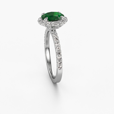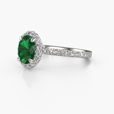 The ring shown above is called the Miranda ovl. We call this type of ring a halo ring because it has one centre gemstone and a band that is also pave set with gemstones. The 14 Carat white gold engagement ring is set with a oval 8x6 mm emerald centre stone and the band is pave set with lab-grown diamonds. What makes this exclusive white gold halo ring special are the smaller sized stones embracing the centre stone. This gorgeous engagement ring is called a halo ring because the smaller gemstones give the centre stone a halo of surrounding light. In order for the smaller stones to enhance the centre stone, they have to be placed so there is no interference of light. And that's when our expert goldsmiths come in. Each individual stone is carefully set in the ring by hand. During manufacturing, light fall is constantly monitored to make sure the special halo is still visible. In the end you get a unique engagement ring, with a emerald of your choosing at its centre. You can imagine the effect of a ring of such significance when you give it to her on her special day to shine. By using a combination of the latest modern techniques, combined with ancient crafting, we can make all our engagement rings in our own studio. Each jewel is made to order. This is advantageous because we can offer you a price you won't find anywhere else.Our designers and goldsmiths work together each day, creating new jewels. Perhaps you have found a nice exclusive engagement ring somewhere, which can be used to customize your unique ring. Please feel free to contact us. We will make you an offer, based on a fair price/ quality ratio, which will amaze you.To make it easier for you, we offer a 30 day return policy. Check our terms and conditions.