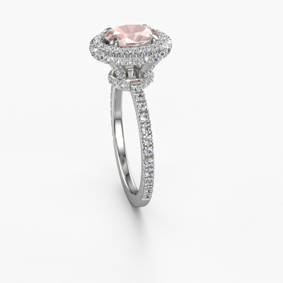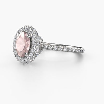 The ring shown above is called the Talitha OVL. We call this type of ring a halo ring because it has one centre gemstone and a band that is also pave set with gemstones. The 14 Carat white gold engagement ring is set with a oval 7x5 mm morganite champagne centre stone and the band is pave set with lab-grown diamonds. What makes this classic white gold halo ring special are the smaller sized stones embracing the centre stone. This gorgeous engagement ring is called a halo ring because the smaller gemstones give the centre stone a halo of surrounding light. In order for the smaller stones to enhance the centre stone, they have to be placed so there is no interference of light. And that's when our expert goldsmiths come in. Each individual stone is carefully set in the ring by hand. During manufacturing, light fall is constantly monitored to make sure the special halo is still visible. In the end you get a unique engagement ring, with a morganite champagne of your choosing at its centre. You can imagine the effect of a ring of such significance when you give it to her on her special day to shine. By using a combination of the latest modern techniques, combined with ancient crafting, we can make all our engagement rings in our own studio. Each jewel is made to order. This is advantageous because we can offer you a price you won't find anywhere else.Our designers and goldsmiths work together each day, creating new jewels. Perhaps you have found a nice classic engagement ring somewhere, which can be used to customize your unique ring. Please feel free to contact us. We will make you an offer, based on a fair price/ quality ratio, which will amaze you.To make it easier for you, we offer a 30 day return policy. Check our terms and conditions.