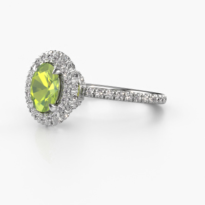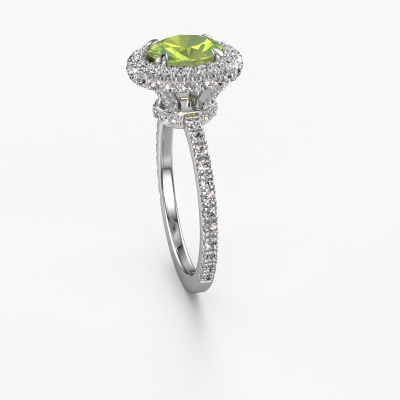 The ring shown above is called the Talitha OVL. We call this type of ring a halo ring because it has one centre gemstone and a band that is also pave set with gemstones. The 14 Carat white gold engagement ring is set with a oval 7x5 mm peridot centre stone and the band is pave set with lab-grown diamonds. What makes this classic white gold halo ring special are the smaller sized stones embracing the centre stone. This gorgeous engagement ring is called a halo ring because the smaller gemstones give the centre stone a halo of surrounding light. In order for the smaller stones to enhance the centre stone, they have to be placed so there is no interference of light. And that's when our expert goldsmiths come in. Each individual stone is carefully set in the ring by hand. During manufacturing, light fall is constantly monitored to make sure the special halo is still visible. In the end you get a unique engagement ring, with a peridot of your choosing at its centre. You can imagine the effect of a ring of such significance when you give it to her on her special day to shine. By using a combination of the latest modern techniques, combined with ancient crafting, we can make all our engagement rings in our own studio. Each jewel is made to order. This is advantageous because we can offer you a price you won't find anywhere else.Our designers and goldsmiths work together each day, creating new jewels. Perhaps you have found a nice classic engagement ring somewhere, which can be used to customize your unique ring. Please feel free to contact us. We will make you an offer, based on a fair price/ quality ratio, which will amaze you.To make it easier for you, we offer a 30 day return policy. Check our terms and conditions.