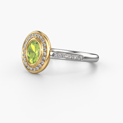 The ring shown above is called the Noud 2 OVL. We call this type of ring a halo ring because it has one centre gemstone and a band that is also pave set with gemstones. The 14 Carat white gold engagement ring is set with a oval 6x4 mm peridot centre stone and the band is pave set with lab-grown diamonds. What makes this exclusive white gold halo ring special are the smaller sized stones embracing the centre stone. This gorgeous engagement ring is called a halo ring because the smaller gemstones give the centre stone a halo of surrounding light. In order for the smaller stones to enhance the centre stone, they have to be placed so there is no interference of light. And that's when our expert goldsmiths come in. Each individual stone is carefully set in the ring by hand. During manufacturing, light fall is constantly monitored to make sure the special halo is still visible. In the end you get a unique engagement ring, with a peridot of your choosing at its centre. You can imagine the effect of a ring of such significance when you give it to her on her special day to shine. By using our modern techniques, we can design and customize the finest quality jewels with the utmost care for you. Our engagement rings are always priced 30 percent lower than other jewellers. We make engagement rings to order so we don't have to maintain a large stock. If you have a certain budget, we are more than happy to advice you accordingly.Have you found a specific engagement ring somewhere which you would like to give to your loved one? Please feel free to express your wishes to our jewel designers because we would be honoured to turn your design into a exclusive engagement ring. You can follow the development of your ring design because we use 3D drawings. This gives you a realistic preview of how your design will look. You can also preorder a dummy. A dummy is a plastic ring, which can be shaped according your ring design. You can try it on and check if its width and size are suitable for you. We will gladly send you a non-binding offer, based on a fair price/ quality ratio. It will amaze you, considering the quality of the ring and gemstones.To make it easier for you, we offer a 30 day return policy. Check our terms and conditions.