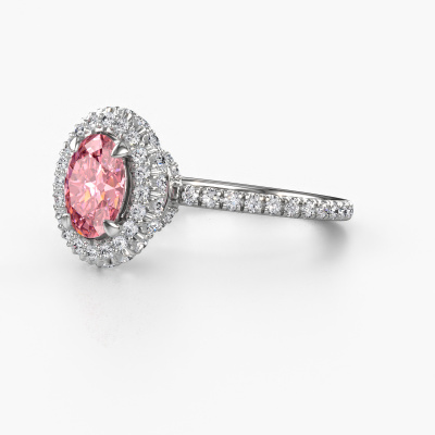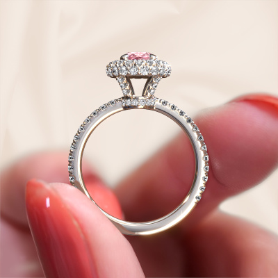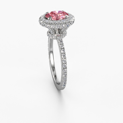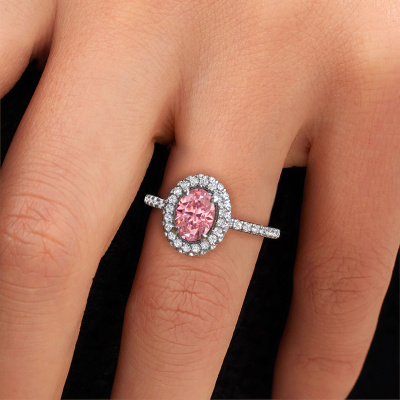 The ring shown above is called the Talitha OVL. We call this type of ring a halo ring because it has one centre gemstone and a band that is also pave set with gemstones. The 14 Carat white gold engagement ring is set with a oval 7x5 mm pink lab grown diamond centre stone and the band is pave set with lab-grown diamonds. What makes this classic white gold halo ring special are the smaller sized stones embracing the centre stone. This gorgeous engagement ring is called a halo ring because the smaller gemstones give the centre stone a halo of surrounding light. In order for the smaller stones to enhance the centre stone, they have to be placed so there is no interference of light. And that's when our expert goldsmiths come in. Each individual stone is carefully set in the ring by hand. During manufacturing, light fall is constantly monitored to make sure the special halo is still visible. In the end you get a unique engagement ring, with a pink lab grown diamond of your choosing at its centre. You can imagine the effect of a ring of such significance when you give it to her on her special day to shine. By using a combination of the latest modern techniques, combined with ancient crafting, we can make all our engagement rings in our own studio. Each jewel is made to order. This is advantageous because we can offer you a price you won't find anywhere else.Our designers and goldsmiths work together each day, creating new jewels. Perhaps you have found a nice classic engagement ring somewhere, which can be used to customize your unique ring. Please feel free to contact us. We will make you an offer, based on a fair price/ quality ratio, which will amaze you.To make it easier for you, we offer a 30 day return policy. Check our terms and conditions.