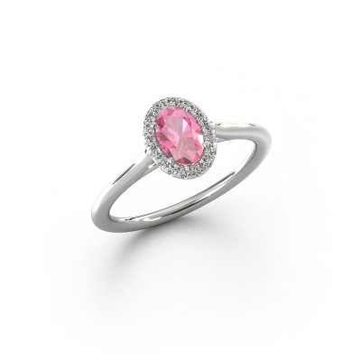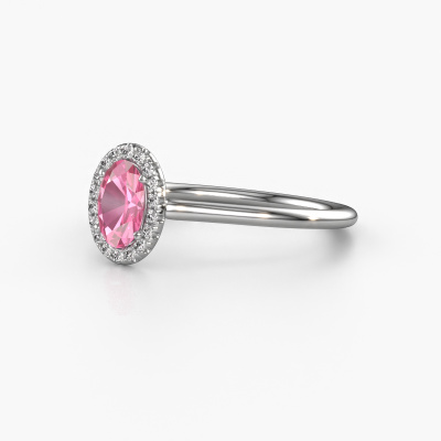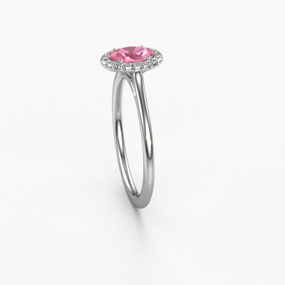 The ring shown above is called the Seline ovl 1. We call this type of ring a halo ring because it has one centre gemstone and a band that is also pave set with gemstones. The 14 Carat white gold engagement ring is set with a oval 6x4 mm pink sapphire centre stone and the band is pave set with diamonds. What makes this classic white gold halo ring special are the smaller sized stones embracing the centre stone. This gorgeous engagement ring is called a halo ring because the smaller gemstones give the centre stone a halo of surrounding light. In order for the smaller stones to enhance the centre stone, they have to be placed so there is no interference of light. And that's when our expert goldsmiths come in. Each individual stone is carefully set in the ring by hand. During manufacturing, light fall is constantly monitored to make sure the special halo is still visible. In the end you get a unique engagement ring, with a pink sapphire of your choosing at its centre. You can imagine the effect of a ring of such significance when you give it to her on her special day to shine. Are you on a budget? Please feel free to contact us, so we can go discuss your options. We offer our engagement rings at guaranteed best price, because we make them to order. You won't find such a price anywhere else!Our team adds new designs to our online collection daily. Our designers and goldsmiths work together in creating the best design. We strive to offer a diverse collection of jewels. Perhaps you have a specific jewel design in mind. One you came across somewhere. Please contact us for a free consultation. We will make you an offer, based on a fair price/ quality ratio, that will baffle you.To make it easier for you, we offer a 30 day return policy. Check our terms and conditions.