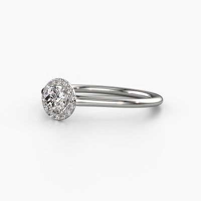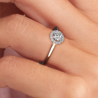 The ring shown above is called the Seline rnd 1. We call this type of ring a halo ring because it has one centre gemstone and a band that is also pave set with gemstones. The 14 Carat white gold engagement ring is set with a round 0.30 crt diamond centre stone and the band is pave set with diamonds. What makes this classic white gold halo ring special are the smaller sized stones embracing the centre stone. This gorgeous engagement ring is called a halo ring because the smaller gemstones give the centre stone a halo of surrounding light. In order for the smaller stones to enhance the centre stone, they have to be placed so there is no interference of light. And that's when our expert goldsmiths come in. Each individual stone is carefully set in the ring by hand. During manufacturing, light fall is constantly monitored to make sure the special halo is still visible. In the end you get a unique engagement ring, with a diamond of your choosing at its centre. You can imagine the effect of a ring of such significance when you give it to her on her special day to shine. By using our modern techniques, we can design and customize the finest quality jewels with the utmost care for you. Our engagement rings are always priced 30 percent lower than other jewellers. We make engagement rings to order so we don't have to maintain a large stock. If you have a certain budget, we are more than happy to advice you accordingly.Different styles of new rings are made daily by our team. Perhaps you have found a halo engagement ring somewhere. One you would like to give to your loved one. Please feel free to share your thoughts and design with our jewel designers. We would love to turn your design into a classic engagement ring. You can follow the development of your ring design because we use very detailed 3D drawings. On top of that, you can order a dummy of the design. A dummy is a plastic ring, which can be shaped according your ring design. You can try it on and check if the engagement ring is up to standard. We will gladly send you a non-binding offer, based on a fair price/ quality ratio. The offer will baffle you, considering the quality of the ring and gemstones.To make it easier for you, we offer a 30 day return policy. Check our terms and conditions.