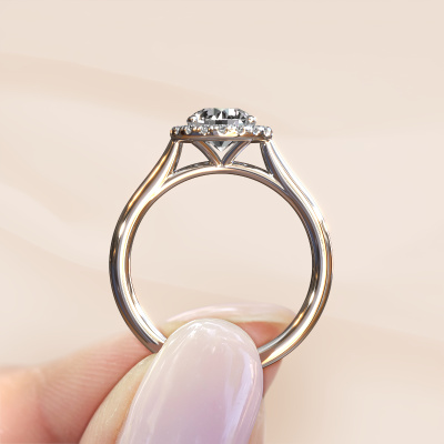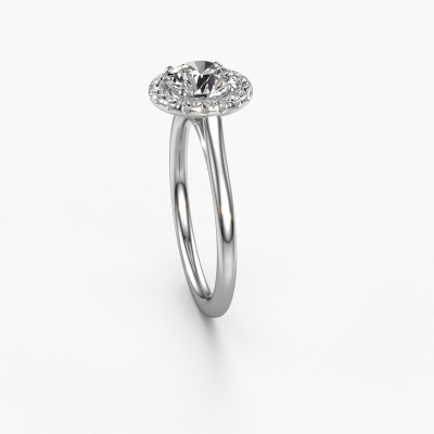 The ring shown above is called the Seline rnd 1. We call this type of ring a halo ring because it has one centre gemstone and a band that is also pave set with gemstones. The 14 Carat white gold engagement ring is set with a round 1.00 crt diamond centre stone and the band is pave set with diamonds. What makes this classic white gold halo ring special are the smaller sized stones embracing the centre stone. This gorgeous engagement ring is called a halo ring because the smaller gemstones give the centre stone a halo of surrounding light. In order for the smaller stones to enhance the centre stone, they have to be placed so there is no interference of light. And that's when our expert goldsmiths come in. Each individual stone is carefully set in the ring by hand. During manufacturing, light fall is constantly monitored to make sure the special halo is still visible. In the end you get a unique engagement ring, with a diamond of your choosing at its centre. You can imagine the effect of a ring of such significance when you give it to her on her special day to shine. By using our modern techniques, we can design and customize the finest quality jewels with the utmost care for you. Our engagement rings are always priced 30 percent lower than other jewellers. We make engagement rings to order so we don't have to maintain a large stock. If you have a certain budget, we are more than happy to advice you accordingly.Different styles of new rings are made daily by our team. Perhaps you have found a halo engagement ring somewhere. One you would like to give to your loved one. Please feel free to share your thoughts and design with our jewel designers. We would love to turn your design into a classic engagement ring. You can follow the development of your ring design because we use very detailed 3D drawings. On top of that, you can order a dummy of the design. A dummy is a plastic ring, which can be shaped according your ring design. You can try it on and check if the engagement ring is up to standard. We will gladly send you a non-binding offer, based on a fair price/ quality ratio. The offer will baffle you, considering the quality of the ring and gemstones.To make it easier for you, we offer a 30 day return policy. Check our terms and conditions.